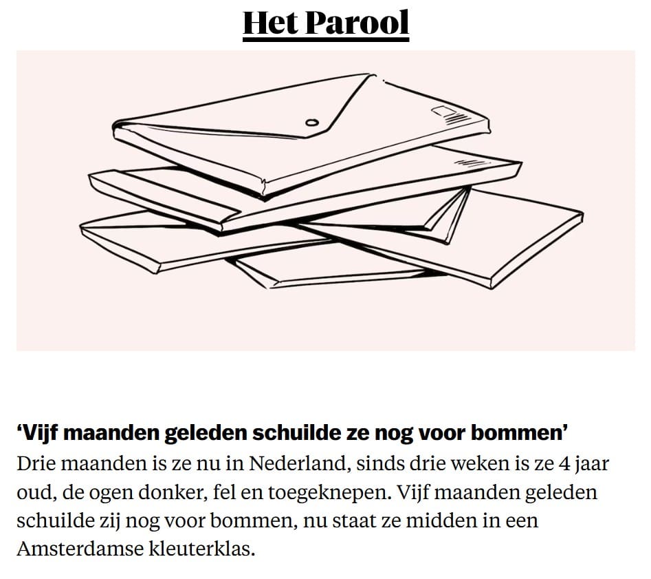 Drie maanden is ze nu in Nederland, sinds drie weken is ze vier jaar oud, de ogen donker, fel en toegeknepen. Vijf maanden geleden schuilde zij nog voor bommen, nu staat ze midden in een Amsterdamse kleuterklas.