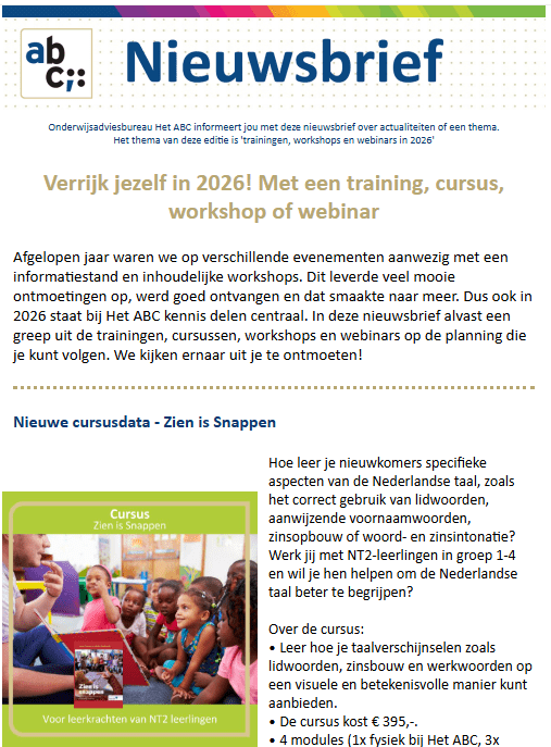 Afgelopen jaar waren we op verschillende evenementen aanwezig met een informatiestand en inhoudelijke workshops. Dit leverde veel mooie ontmoetingen op, werd goed ontvangen en dat smaakte naar meer. Dus ook in 2026 staat bij Het ABC kennis delen centraal. In deze nieuwsbrief alvast een greep uit de trainingen, cursussen, workshops en webinars op de planning die je kunt volgen. We kijken ernaar uit je te ontmoeten!