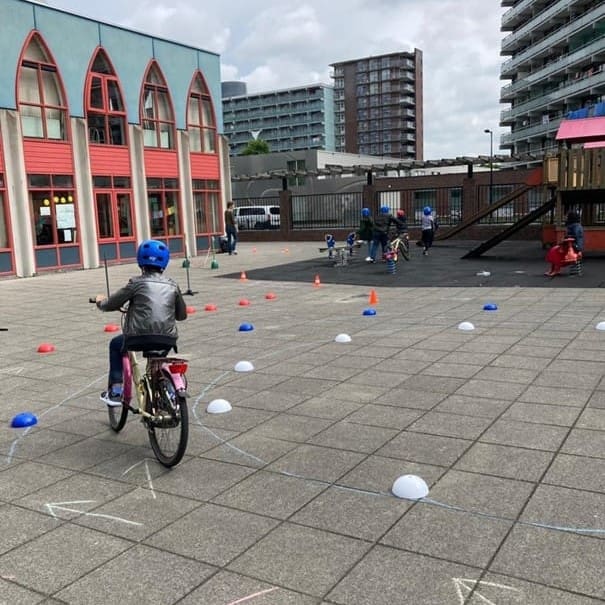 2. Daarna gaan de leerlingen naar buiten, waar een uitdagend fietsparcours op het schoolplein is uitgezet. Dit parcours wordt opgebouwd met speciaal lesmateriaal van Verkeerskunsten. De leerlingen oefenen met bochten, stoppen, over hun schouder kijken en andere belangrijke fietsvaardigheden. Alles gebeurt onder begeleiding van ervaren uitvoerders en is afgestemd op het niveau van de kinderen.